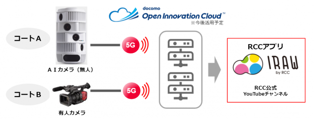 これはスポーツの試合を無人操作のAIカメラで撮影し、NTTドコモ5Gを利用して伝送、RCCのアプリ「IRAW」やRCC公式YouTubeチャンネルでライブ配信するもので、コロナ禍において無観客または入場制限を余儀なくされる地域スポーツの応援を目的とし、効率的にコンテンツ化してライブ配信できる環境を構築します。当日、準決勝戦2試合は同時並行に行われるため、1試合をAIカメラで無人撮影、もう1試合を有人カメラ撮影した2系統の映像をそれぞれ5Gで伝送します。ライブ配信後はアーカイブ配信も予定しています。