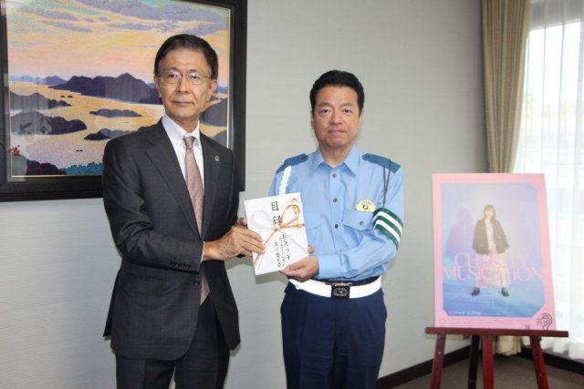 RCC 宮迫良己 社長から 広島県警 岡崎玲史 交通部長に目録を贈呈。